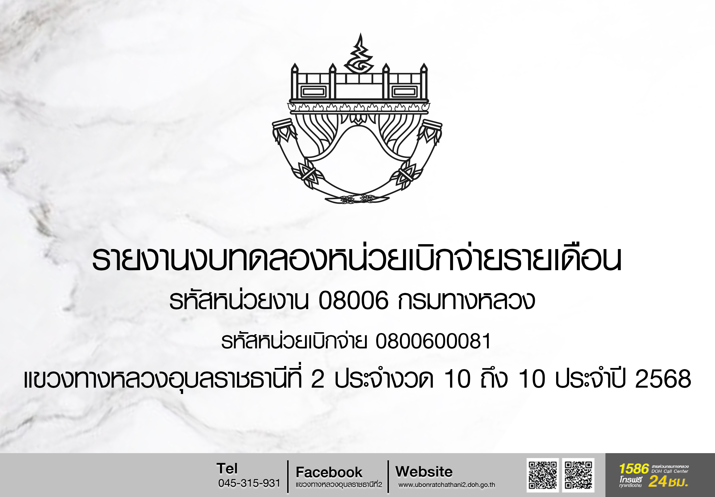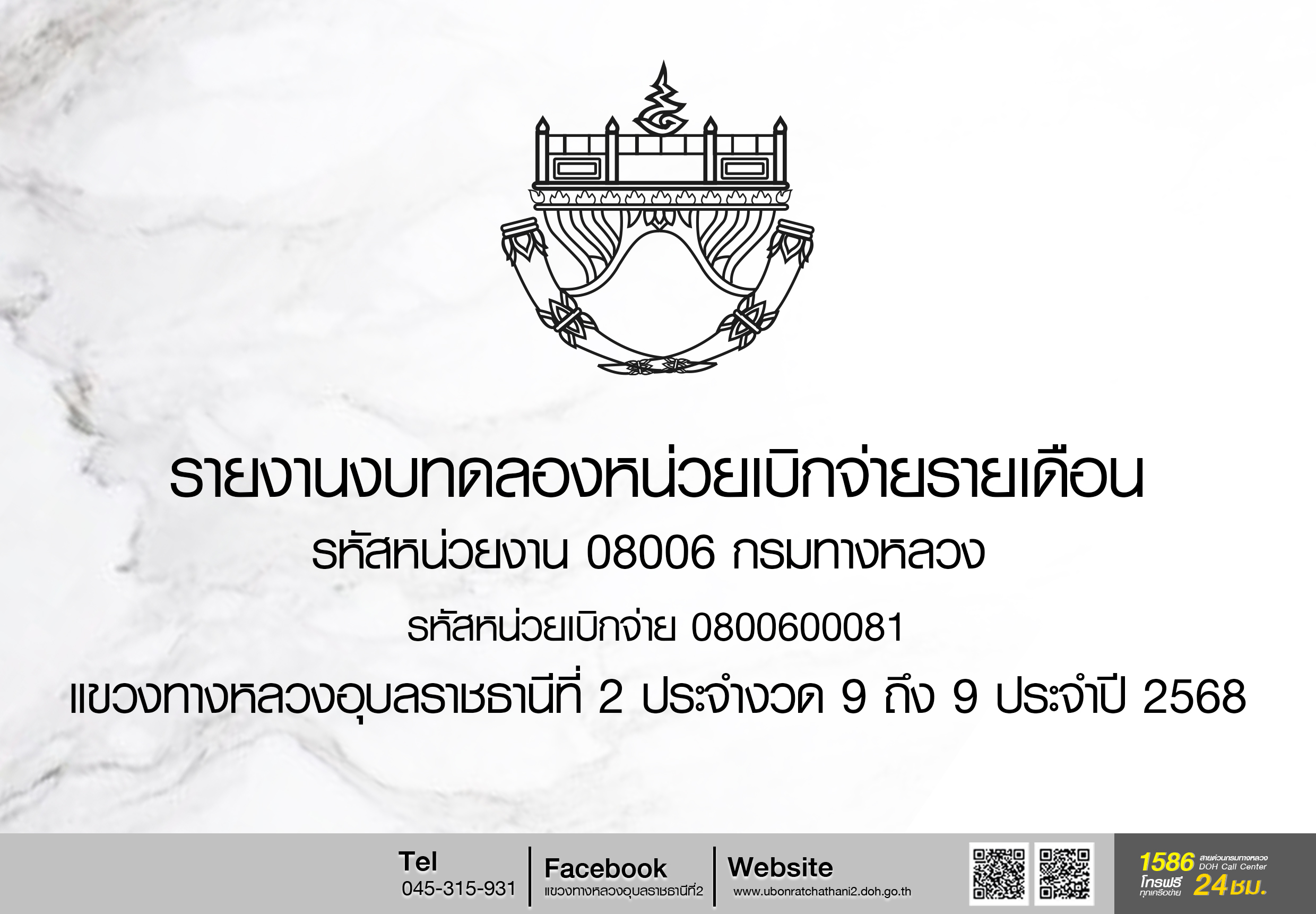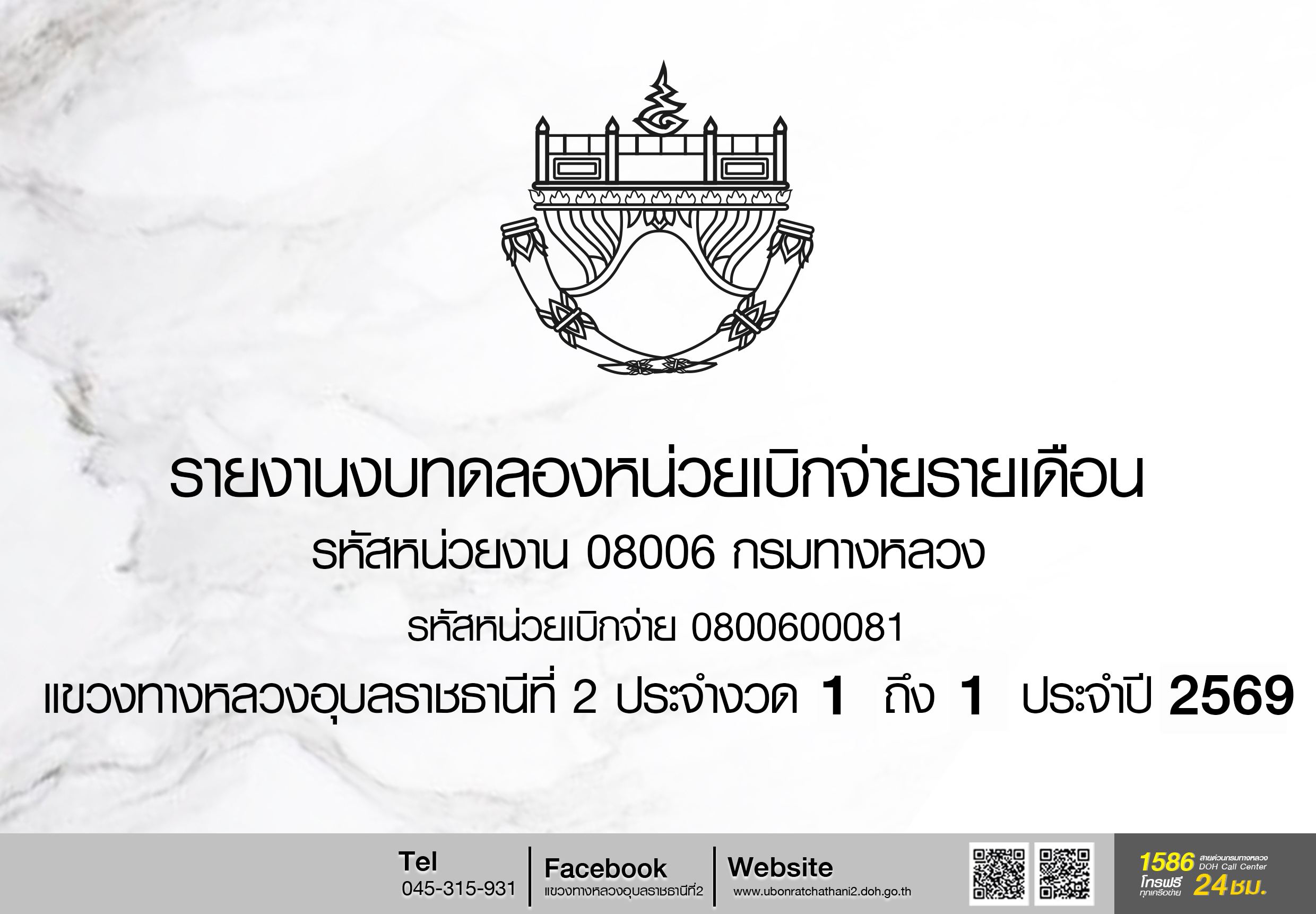 รายงานงบทดลองหน่วยเบิกจ่ายรายเดือน รหัสหน่วยงาน 08006 กรมทางหลวง รหัสหน่วยเบิก 0800600081 แขวงทางหลวงอุบลราชธานีที่ 2 ประจำงวด 1 ถึง 1 ปี 2569