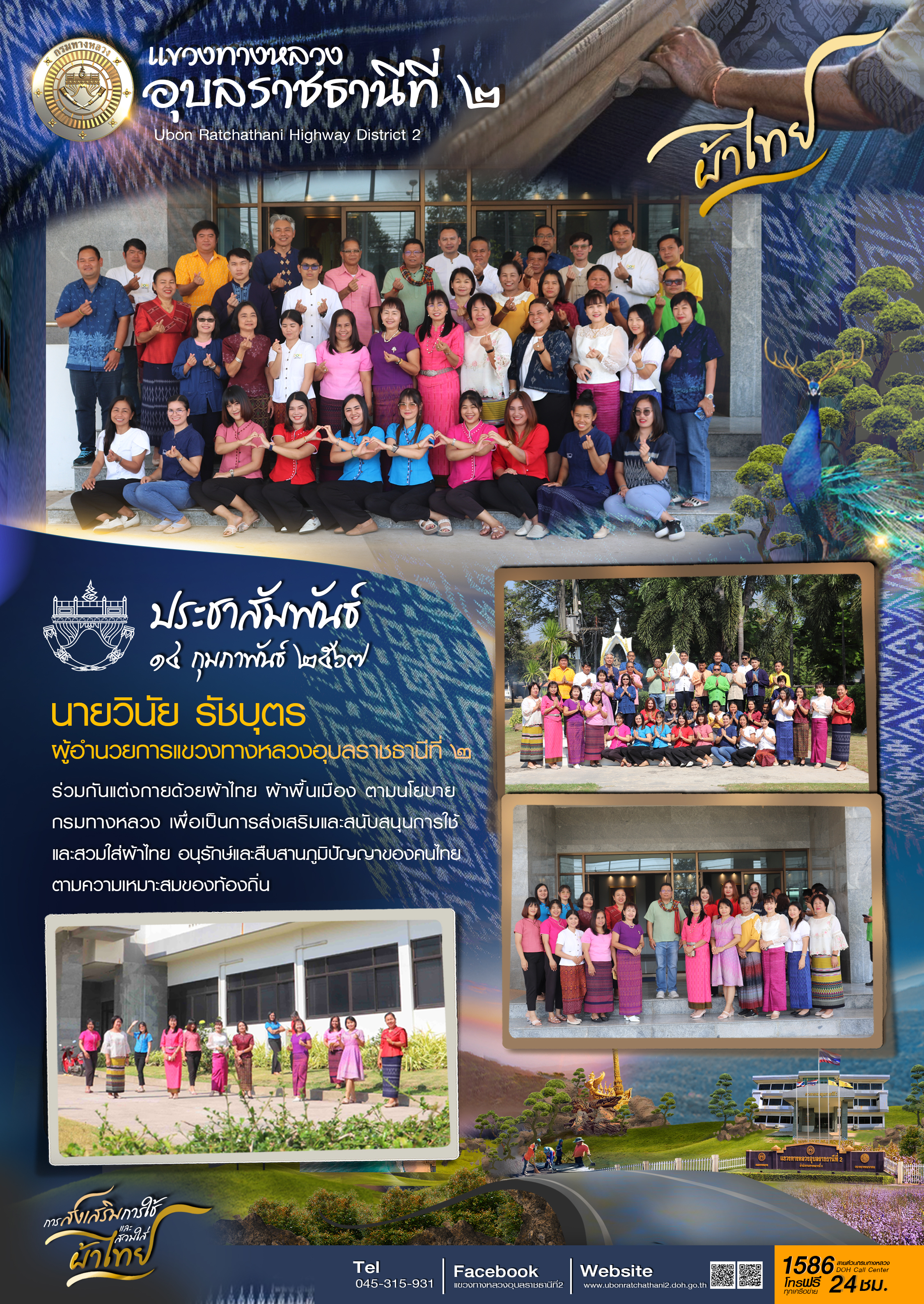 ประชาสัมพันะ์ 14 กุมภาพันธ์ 2567 นายวินัย รัชบุตร ผู้อำนวยการแขวงทางหลวงอุบลราชธานีที่ 2 ร่วมกันแต่งกายด้วยผ้าไทย ผ้าพื้นเมือง ตามนโยบาย กรมทางหลวง เพื่อเป็นการส่งเสริมและสนับสนุนการใช้ และสวมใส่ผ้าไทย อนุรักษ์และสืบสานภูมิปัญญาของคนไทยตามความเหมาะสมของท้องถิ่น