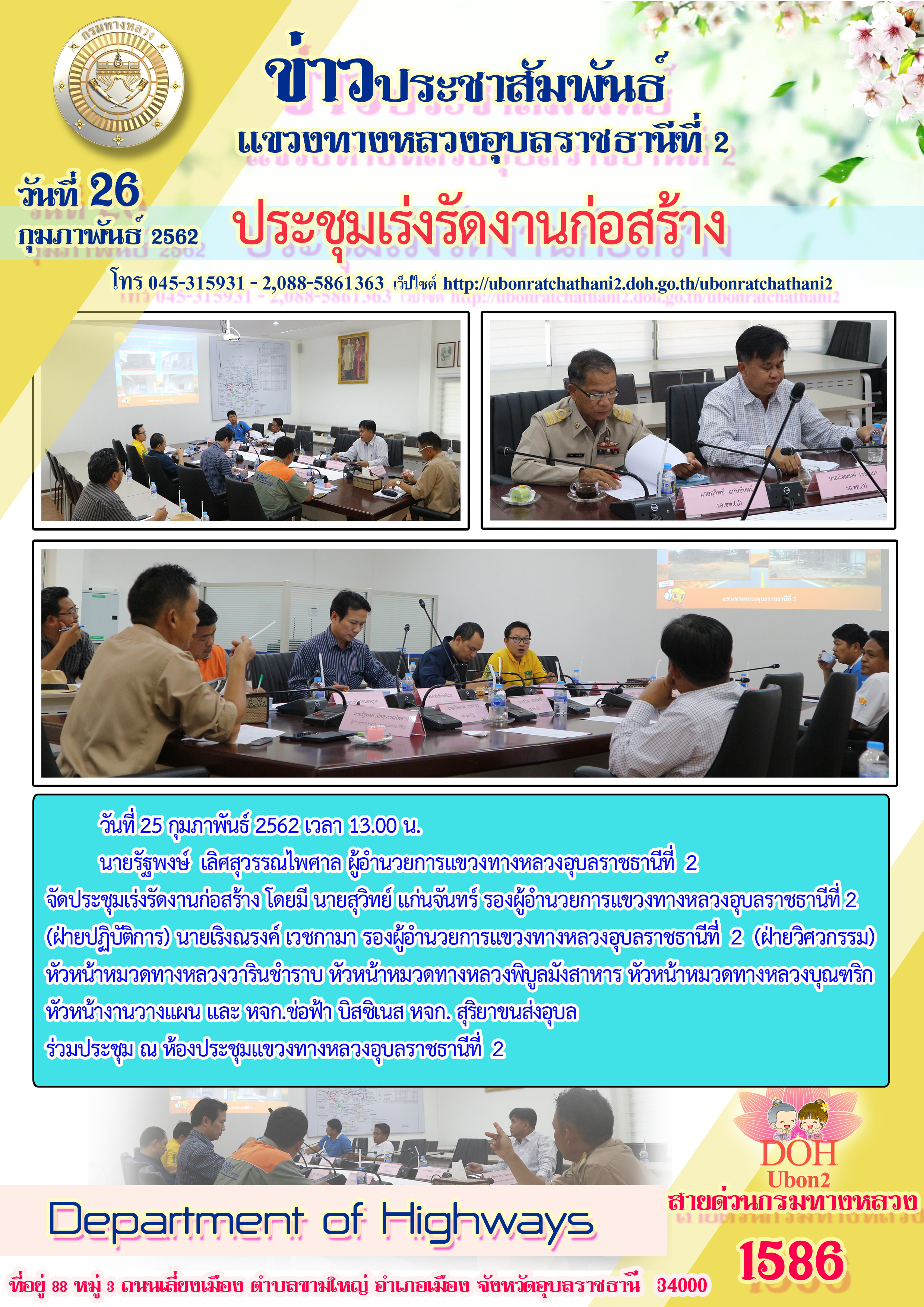 นายรัฐพงษ์ เลิศสุวรรณไพศาล ผู้อำนวยการแขวงทางหลวงอุบลราชธานีที่ 2 จัดประชุมเร่งรัดงานก่อสร้าง โดยมี นายสุวิทย์ แก่นจันทร์ รองผู้อำนวยการแขวงทางหลวงอุบลราชธานีที่ 2 (ฝ่ายปฏิบัติการ) นายเริงณรงค์ เวชกามา รองผู้อำนวยการแขวงทางหลวงอุบลราชธานีที่ 2 (ฝ่ายวิศวกรรม) หัวหน้าหมวดทางหลวงวารินชำราบ หัวหน้าหมวดทางหลวงพิบูลมังสาหาร หัวหน้าหมวดทางหลวงบุณฑริก หัวหน้างานวางแผน และ หจก.ช่อฟ้า บิสซิเนส หจก. สุริยาขนส่งอุบล ร่วมประชุม ณ ห้องประชุมแขวงทางหลวงอุบลราชธานีที่ 2